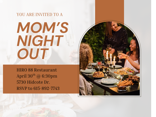 MOMS' NIGHT OUT: Moms, it’s your night on Thursday, April 30! Join us for a Mom’s Night Out on Thursday, April 30 at 6:30pm at Hiro 88. Come enjoy great food, laughter, and meaningful connection with other amazing moms. RSVP to Taleah at 615.892.7743; we’d love to know you’re coming!
